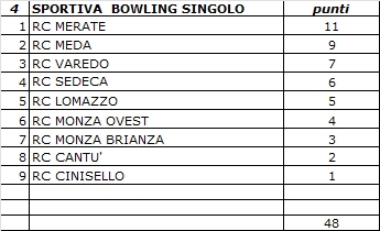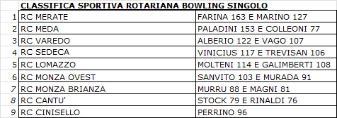 E veniamo ai vincitori assoluti della gara di bowling singolo che ricordo essere calcolato sul miglior punteggio dei giocatori sia Rotariani che Simpatizzanti, e sono risultati vincitori: primo Luca Farina con 163 punti del RC Merate Brianza, secondo Maurizio Paladini con 153 punti del Rotary Club Meda e delle Brughiere, e terzo Giuseppe Marino con 127 punti del Rotary Club Merate Brianza.